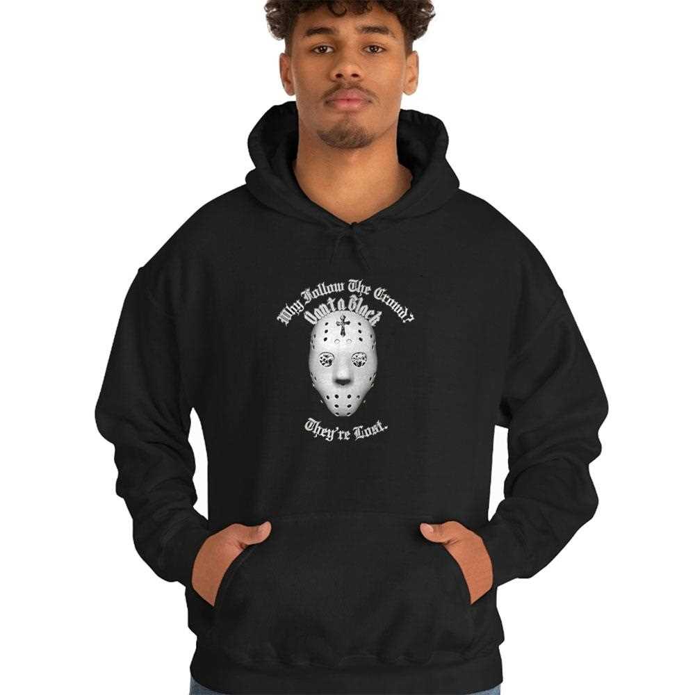A piece of advice from a man who knows a thing or two about being a loner. This dark and funny t-shirt features Jason Voorhees’ iconic hockey mask with the question, “WHY FOLLOW THE CROWD? THEY’RE LOST.” Forge your own path… preferably not through Camp Crystal Lake. The perfect tee for the horror fan and the independent thinker who isn’t afraid to go their own way..