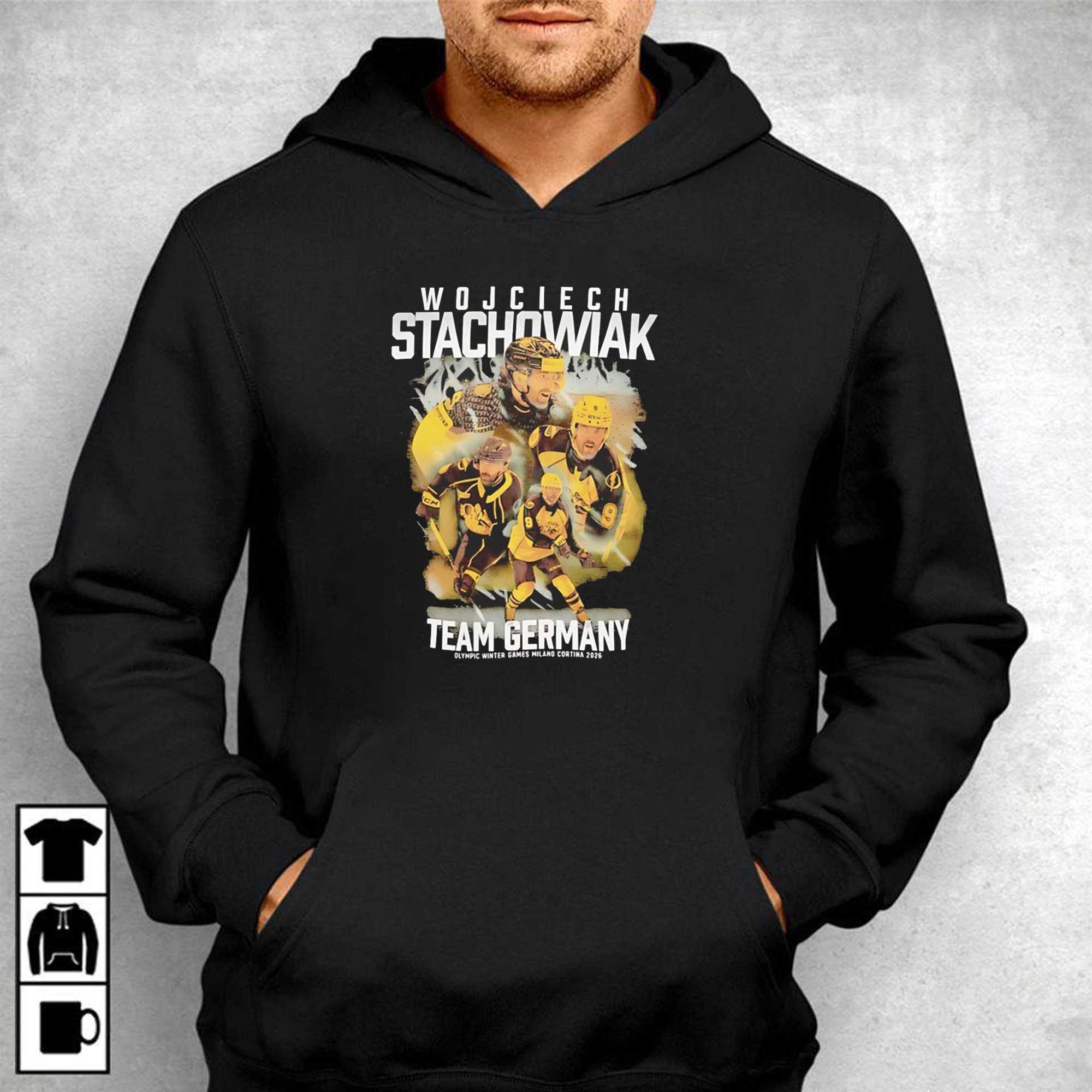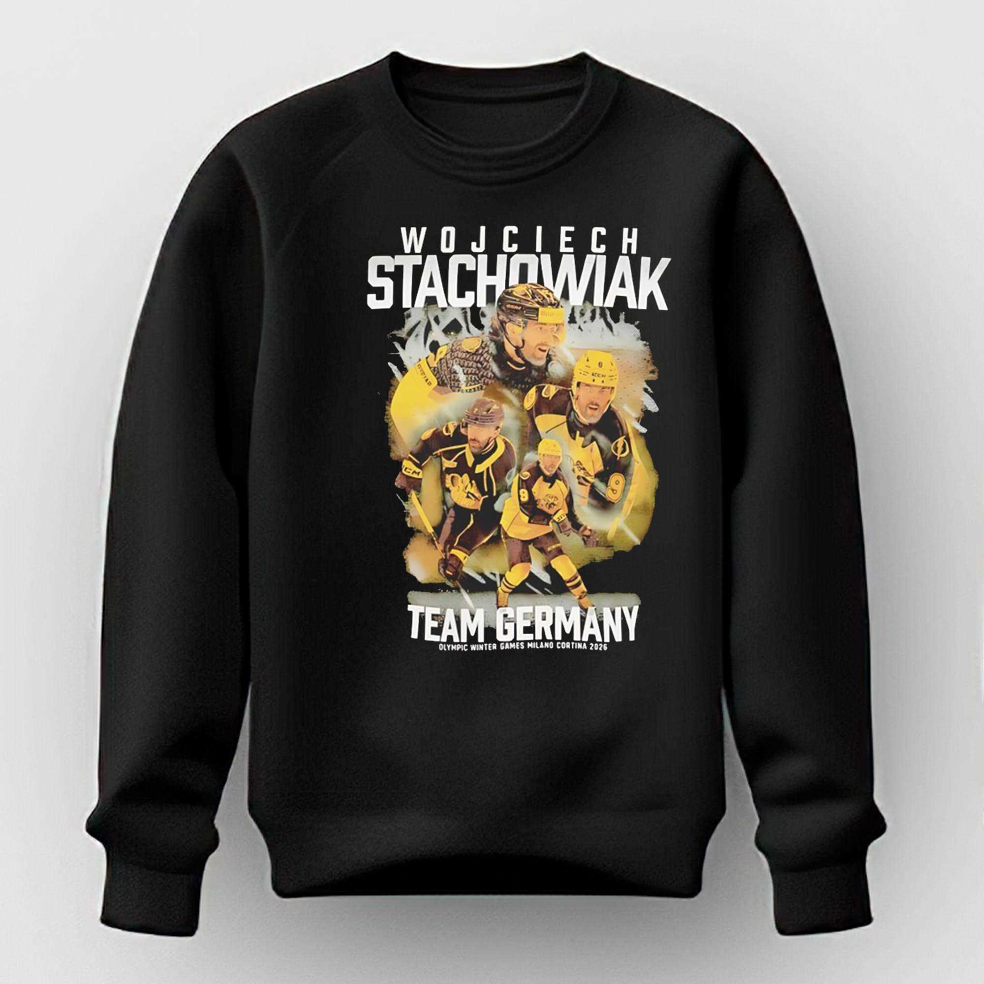 Represent the speed and the skill of international hockey with the Wojciech Stachowiak For Team Germany At The Milano Cortina 2026 Winter Olympics Tee. This design is a sharp and authoritative tribute to the pride of German athletics, featuring a dynamic graphic of Stachowiak in action, framed by the official colors of the national flag and the Milano Cortina 2026 branding. It captures the high-octane energy of the winter games and the unyielding spirit of the German squad as they take the world stage.The artwork utilizes a professional, high-contrast black and gold palette, creating a look that is both athletic and sophisticated. Crafted from a high-performance performance cotton blend, this tee offers exceptional breathability and comfort for your own winter adventures or casual watch parties. The high-resolution print ensures every detail of the team jersey and the tournament motifs remains clear and sharp. It represents the ambition, the discipline, and the tradition of the Olympic movement.Show your national pride and your support for the elite athletes of the rink with a look that commands respect. Whether you are a fan of hockey or just love a good piece of patriotic gear, this tee is a definitive choice. Stand tall and lead the cheer for Team Germany. Secure your spot in the fan base. Purchase your Wojciech Stachowiak For Team Germany At The Milano Cortina 2026 Winter Olympics Tee today!. T-shirt !