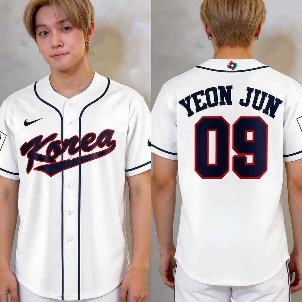 Prepare to celebrate the spirit of the game with the Yeon Jun Korea Baseball 2026 World Baseball Classic Jersey! This design masterfully blends classic baseball aesthetics with fan enthusiasm. On a crisp white canvas, dark blue piping outlines the button placket, collar, and sleeve cuffs, framing the bold “Korea” emblazoned across the chest in a vibrant red script with a sharp navy outline. The back proudly features “YEON JUN” in strong navy capital letters, arched above the commanding number “09,” rendered in a matching navy with a striking red border. It’s a witty nod to the iconic baseball uniform, allowing you to showcase your unwavering support for Team Korea and a player named Yeon Jun with undeniable style and passion.