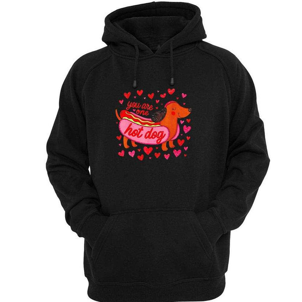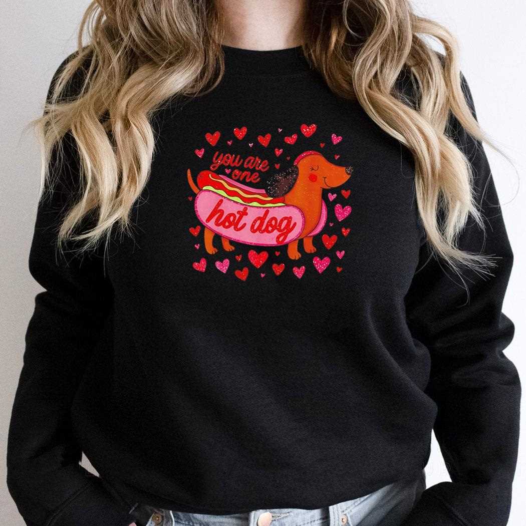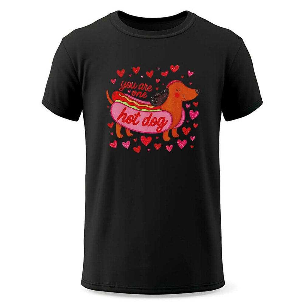 Spread some “puppy love” with this adorable and puns-filled Valentine’s Day dachshund tee. The design features a cute, heart-framed dachshund reimagined as a classic “hot dog,” complete with the charming caption, “You Are One Hot Dog.” The vibrant red and pink tones create a warm, romantic vibe that’s perfect for the season of love. Crafted from a high-grade, breathable cotton fabric, this shirt provides a soft and cozy feel that you’ll love to wear. The side-seamed fit and double-needle stitching throughout ensure a high-quality finish that lasts. It’s an exemplary gift for dog lovers, dachshund owners, and anyone who appreciates a sweet and silly pun. Whether you’re celebrating with a partner or your favorite furry friend, this tee is a delightful way to show you care. Treat your favorite ‘hot dog’ to something special—buy the You Are One Hot Dog Valentine Dachshund Tee today!. T-shirt !