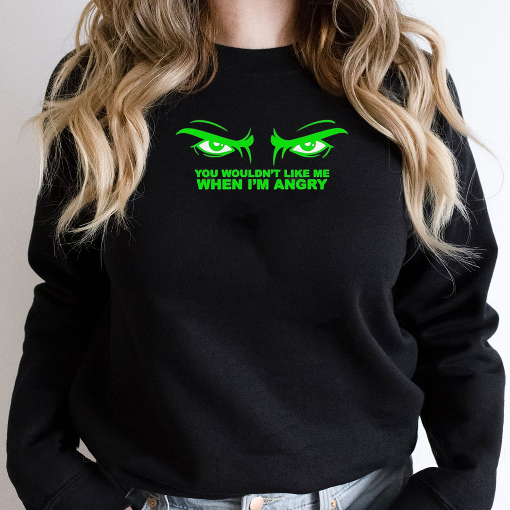 Unleash your inner powerhouse with this visually stunning tribute to the most iconic transformation in pop culture history. The design focuses on a pair of menacing, hyper-detailed neon green eyes that seem to glow with an intense, radioactive energy from the depths of the black fabric. Directly beneath this striking visual, the legendary warning “You wouldn’t like me when I’m angry” is emblazoned in a matching high-voltage green font, capturing the raw intensity and hidden strength of the Marvel-inspired aesthetic. This tee is engineered for maximum visual impact, utilizing specialized high-density inks that provide a textured feel and a vividness that commands attention from across the room. Made from an ultra-soft, mid-weight cotton-poly blend, it offers the perfect balance of durability for intense gym sessions and the breathability needed for casual urban exploration. The minimalist yet aggressive layout appeals to fans of classic superhero lore as well as those who simply appreciate edgy, high-contrast graphic design. Every stitch is reinforced to ensure the garment survives your most “heroic” adventures, while the tagless interior design prevents irritation for all-day comfort. Wear it as a badge of honor that signals your resilience and the fierce spirit that lies just beneath the surface. Activate your strength and grab your You Wouldnt Like Me When Im Angry Tee right now to dominate the streets in style!. T-shirt !