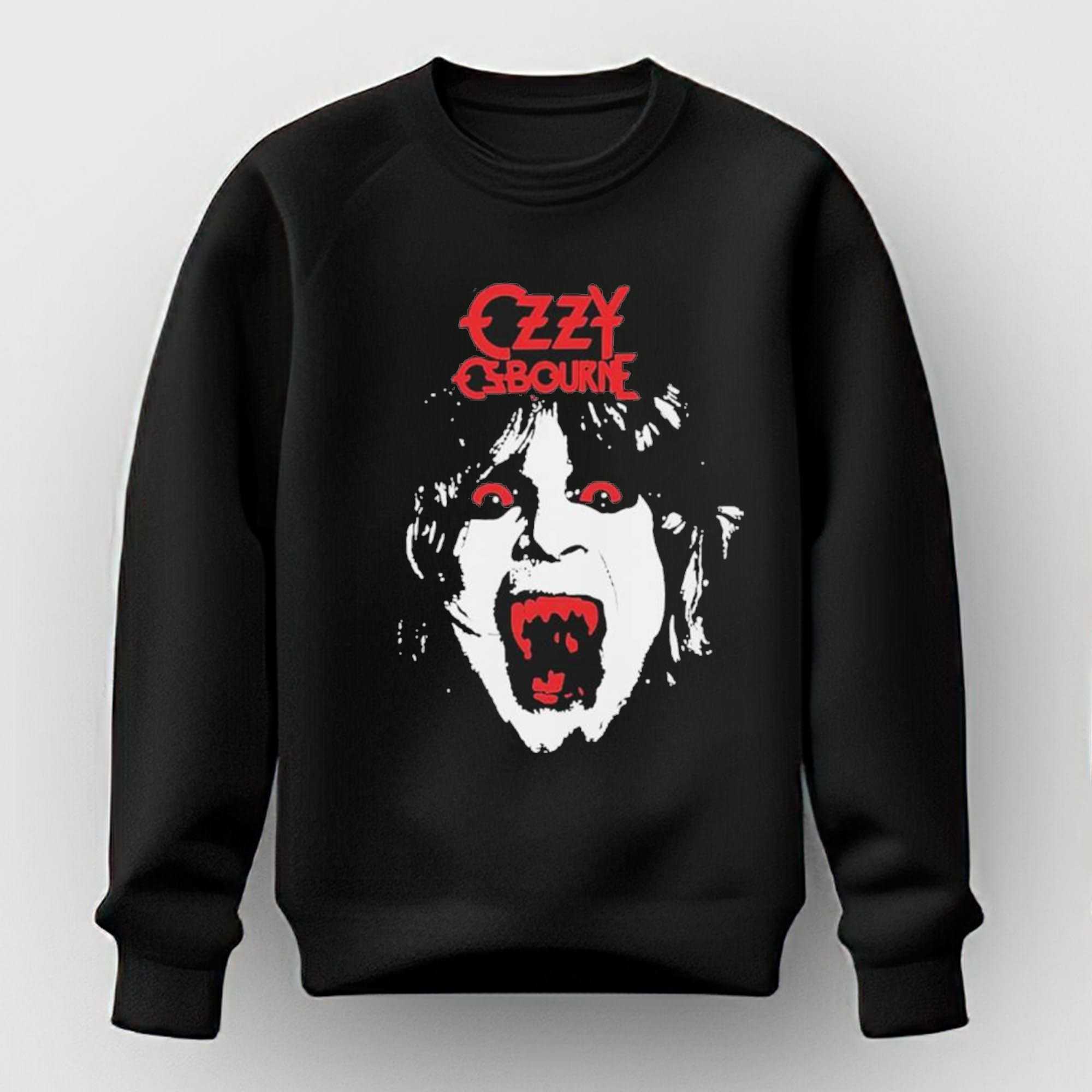 Unleash your inner Prince of Darkness with the **Yungblud Ozzy Osbourne Vampire Shirt**! This striking design captures the legendary rock icon as a fearsome vampire, featuring his name ‘OZZY OSBOURNE’ in bold, signature red, metal-style lettering proudly positioned above a stark, white, vampiric face. His eyes glow an intense red, matching the vibrant fangs and tongue exposed in a wide, menacing snarl, all framed by hints of wild, dark hair. It’s a brilliant visual pun on Ozzy’s iconic ‘Prince of Darkness’ moniker, transforming his dramatic stage persona into a literal creature of the night, perfect for fans who appreciate his enduring legacy and darkly humorous charm.