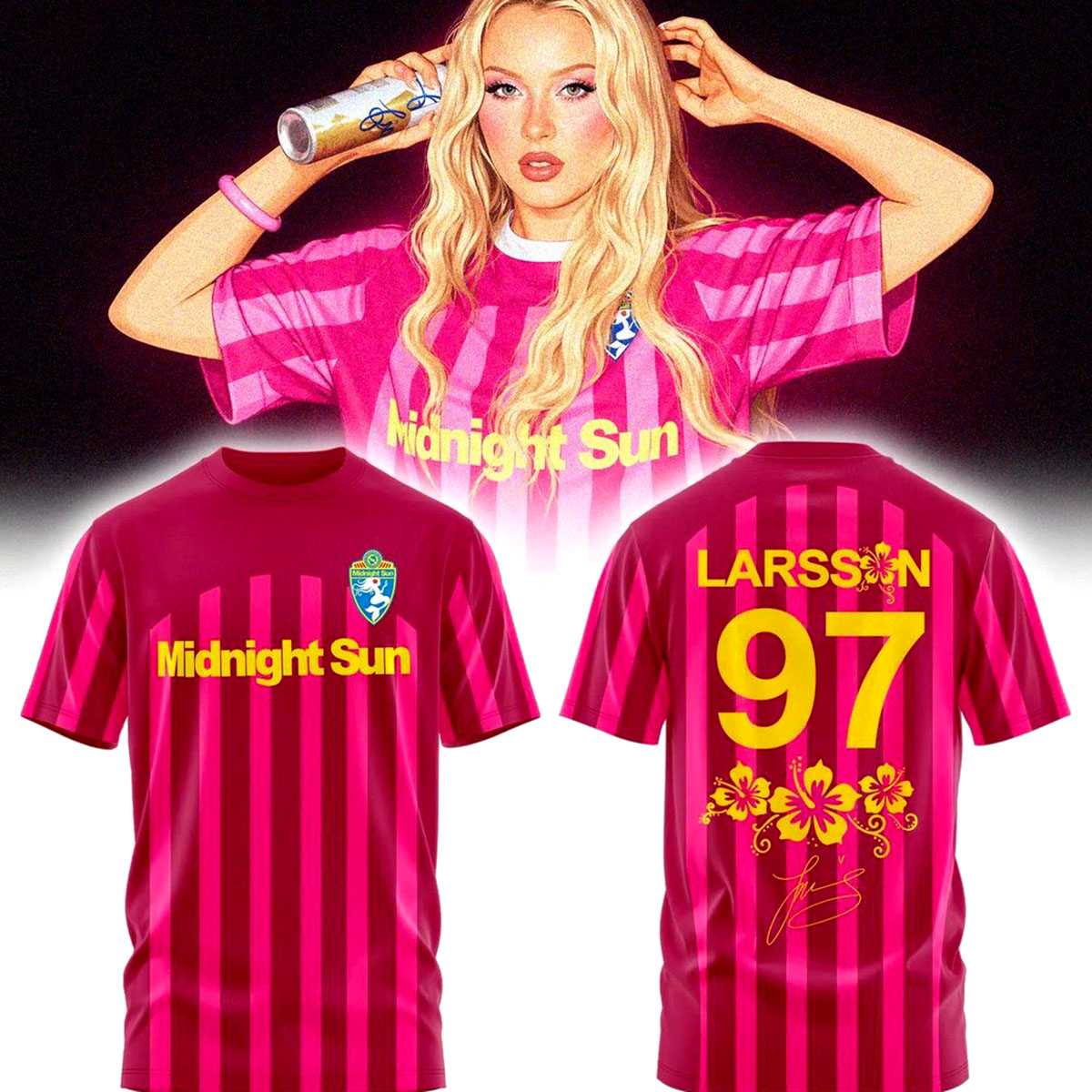 Light up your wardrobe with the Zara Larsson Midnight Sun Tour 2026 T-Shirt. This eye-catching magenta and pink shirt features a bold, athletic-inspired design. The front displays “Midnight Sun” in a sleek white script over a vibrant, color-blocked background that captures the energy of the summer tour. The back of the shirt features a jersey-style layout with “LARSSON 97” and Zara’s signature, giving it a cool, sporty vibe. The use of bright, saturated colors makes this shirt a standout piece at any concert or summer event. It’s a modern, high-fashion take on traditional tour merch. Made from a breathable, athletic-grade fabric, this t-shirt is designed to keep you cool and comfortable all day long. The tagless design ensures a smooth fit, and the high-quality sublimation printing means the colors will never fade or peel. It’s a durable and stylish tribute to one of pop’s biggest stars. Get ready to dance the night away under the midnight sun. This shirt is an essential for every Zara Larsson fan. Order your Zara Larsson Midnight Sun Tour 2026 T-Shirt now and represent the tour in style!